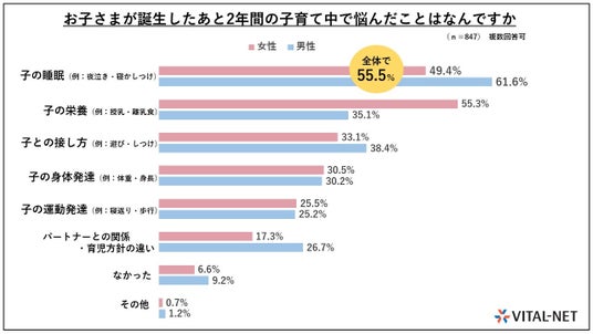 ・「お子さまが生まれたあと2年間の子育ての中で悩んだこと」として最も多かったのは「子の睡眠(例:夜泣き・寝かしつけ)」(55.5%)である。