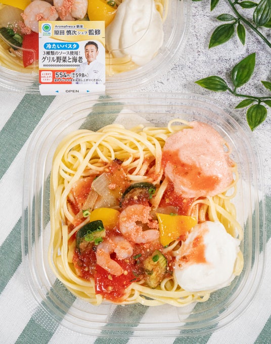 このたび、「AromaFresca銀座 原田慎次シェフ監修 冷たいパスタ3種ソース使用!グリル野菜と海老」554円(税込598円)を発売いたします。アロマフレスカ風の3種のソースのハーモニーがお楽しみいただける、夏にぴったりの冷たいパスタです。トマトのフレッシュ感とマスカルポーネの旨味、そして明太子の風味にこだわった味わいをぜひお召し上がりください。