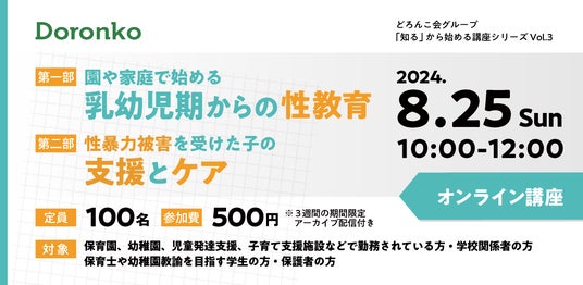 どろんこ会グループ(本社:東京都渋谷区 理事長:安永愛香/代表:高堀雄一郎)は2024年8月25日(日)、子育て支援関係者・保護者の方をはじめ広く一般の方に向け、「乳幼児期の性教育」講座をオンラインで開催します。