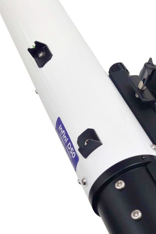 infini D50では、初心者でも直感的に使えるよう、調整不要の「オープンサイト式ファインダー」を採用しました。これは、鏡筒に固定された2つの照準用突起を使って目標を狙うシンプルな構造で、低倍率のアイピースを装着すれば、そのまま視野内に目標の天体を導入できます。望遠鏡が初めてという方でも、スムーズに操作していただけます。さらに、本格的なファインダーへのステップアップにも対応できるよう、標準でファインダー台座も装備しています。