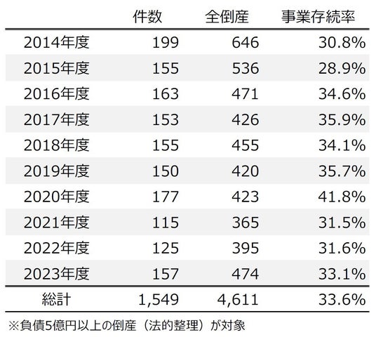 倒産前後や手続き内での事業譲渡や自主再建等によって、法的整理後も当該企業の「事業」が存続した「事業存続型倒産」(負債5億円以上が対象)は、2014年度以降の10年間で1549件が確認できた。最も多かったのは2014年度の199件、次いで2020年度の177件となった。2023年度は157件となり、2年連続で増加した。