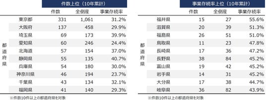 都道府県別に見ると、過去10年間の累計件数では「東京都」(331件)、「大阪府」(137件)が多いが、いずれも事業存続率は低い。