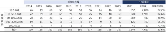 従業員規模別に分析すると、過去10年間の累計で最も多かったのは「10-50人未満」の628件。次いで「10人未満」の552件となったが、いずれも事業存続率は全体(33.6%)を下回った。