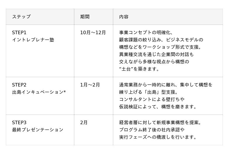*出島インキュベーション:新たな事業アイデアを実践的なビジネスモデルへと落とし込むためのインキュベーションプログラムです。企業内起業家は「出島」として、既存の事業から分離された環境で、顧客と市場に徹底的に向き合い、事業構造や収益構造の実現可能性を検証していきます。