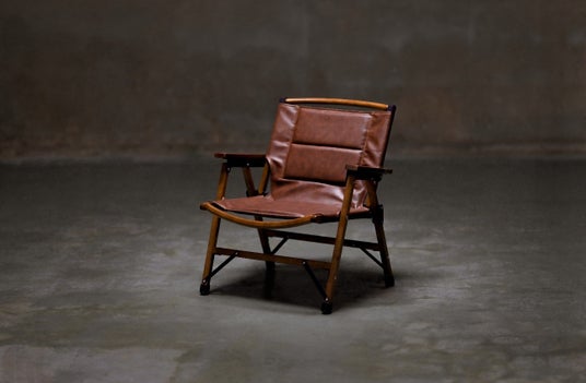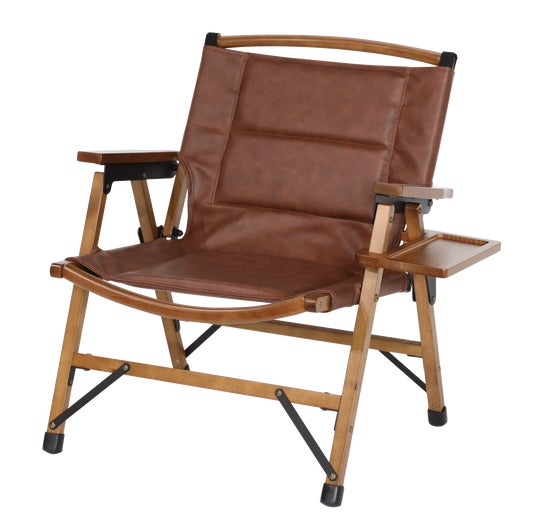 累計販売台数2万台を超える、QUICKCAMPの名作チェア、ウッドローチェアを基に、番組出演の芸人、とろサーモン村田秀亮さんとソラシド本坊元児さんのアイデアを盛り込んだ、ダンディに振り切ったチェア。よりダンディさを際立たせるため、通常の4倍のウレタン厚を採用することで革張りのソファをイメージ。サンプル生地を手にした瞬間、村田さんと本坊さんが一目惚れしたレザー生地を採用しました。合皮の劣化を予防するUVカット加工、火の粉に強い難燃加工でアウトドアシーンでも安心してご使用できます。サイドテーブルは、左利きの村田さんの要望を取り入れ、着脱可能で左右両方に取り付けられるように設計されています。そのため、利き手がどちらでも使用感を損ないません。アームレストは腕をおいてリラックスしやすいように通常より幅広に。