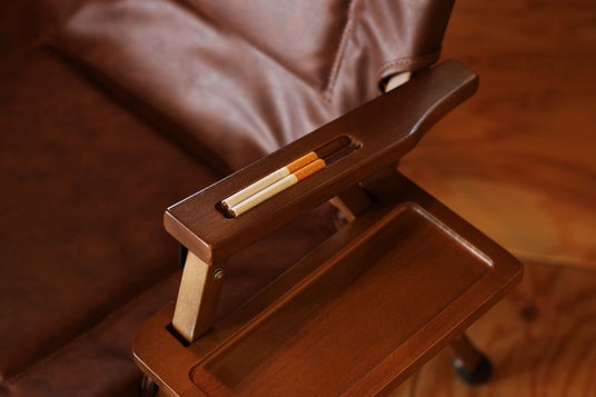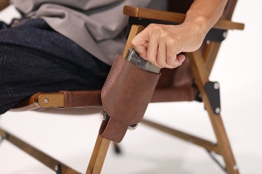 番組内で実施された企画大喜利では、「煙草が置ける場所が欲しい」、「ガンホルダーを付けたい」といったアウトドアギアの固定概念を覆すようなダンディを連想させるアイデアが飛び交い、それらを実用的にし具現化。アームレストに溝加工を施すことで煙草置き兼、折りたたみ箸置きとして実現。ガンホルダーはスマホも収納できるサイドポーチにすることで大喜利アイデアを取り入れました。(ガンホルダーはダンディーチェアを予約していただいた方、先着100名様限定にノベルティプレゼント。)