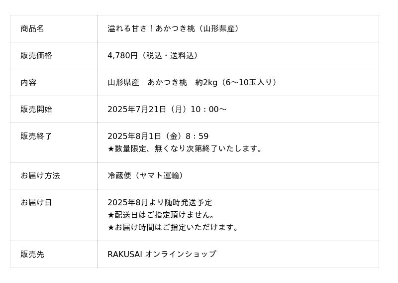 楽彩株式会社(本社:東京都足立区/代表取締役社長:大崎善保)は、2025年7月21日(月)10:00より、この夏一番の旬を迎える山形県産「溢れる甘さ!あかつき桃」の販売を公式オンラインショップにて開始いたします。