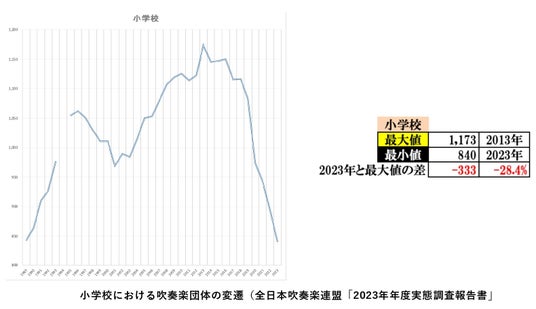 全国の吹奏楽団体の変遷。10年で約3割の吹奏楽団体が消滅している。
