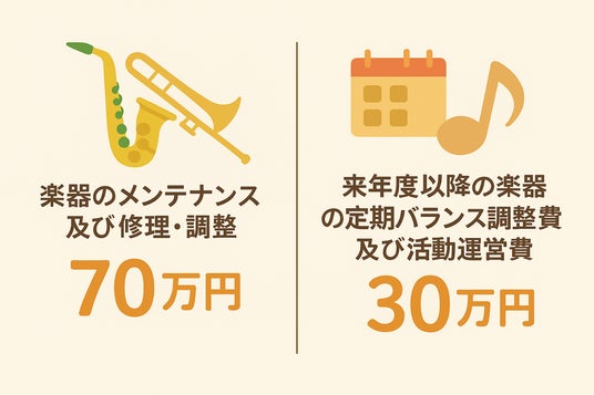 1.楽器の一斉メンテナンス及び修理・調整費。老朽化した譜面台の購入費(70万円)