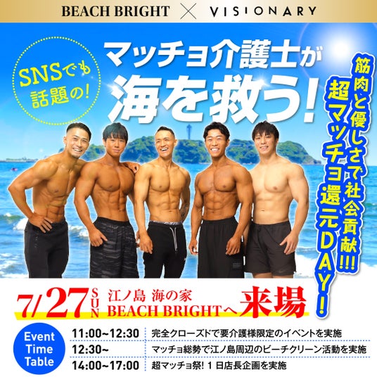 株式会社ビジョナリー(代表取締役社長:丹羽 悠介、本社:愛知県名古屋市)は、神奈川県・江ノ島の西浜/鵠沼海岸(神奈川県藤沢市片瀬海岸2-19-1)にオープンしている海の家「beach bright」にて株式会社ビジョナリーのマッチョ介護士が一日店長を務めるコラボイベントの開催が決定いたしました。