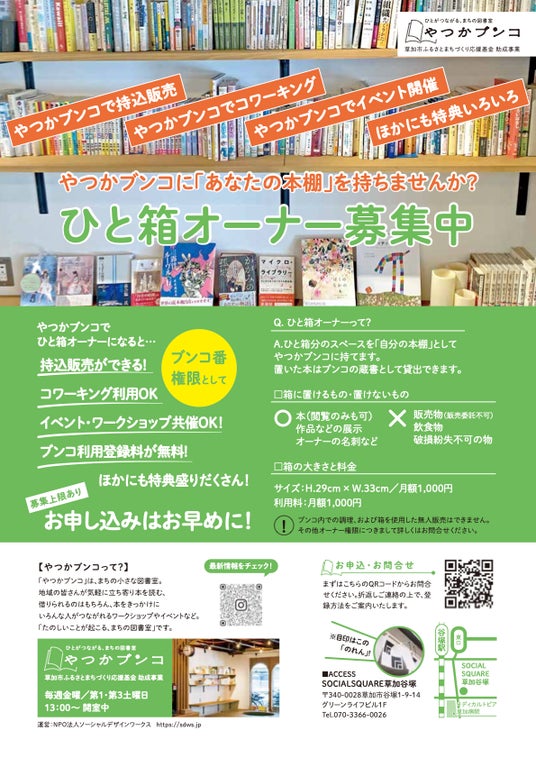 ソーシャルスクエア草加谷塚店(運営:NPO法人ソーシャルデザインワークス 代表理事:北山剛)内で運営される私設図書室「やつかブンコ」にて、新たに「一箱オーナー」サービスが開始されました。