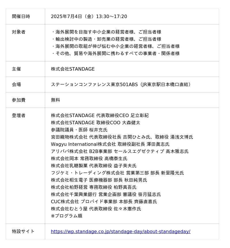 株式会社STANDAGE(本社:東京都港区、代表取締役CEO:足立彰紀)は、2025年7月4日(金)、中小企業の海外進出を支援する年次イベント「STANDAGE DAY 2025」をステーションコンファレンス東京にて開催いたしました。昨年に続き2回目の開催となった本イベントには、全国から278名が申込み、当日は201名が参加。企業の輸出促進に関心を持つ多くの参加者にご来場いただき、大盛況となりました。