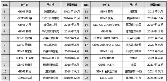 ※GEMSシリーズは野村不動産株式会社、野村不動産投資顧問株式会社が運用を受託する野村不動産マスターファンド投資法人及び野村不動産プライベート投資法人が所有し、野村不動産コマース株式会社が一括して施設運営を行っています。