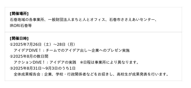 一般財団法人まちと人と(所在地:宮城県石巻市/代表理事:斉藤誠太郎)は、高校生の職業体験型ボランティア『DIVE!』を開催いたします。