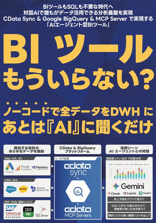 CData Software Japan 合同会社(本社:アメリカノースカロライナ州、日本オフィス:宮城県仙台市、代表社員 職務執行者:疋田 圭介、以下CData)は、2025年8月5日(火)~ 6日(水)に東京ビッグサイトにて開催される Google Cloud Next Tokyo(主催:グーグル・クラウド・ジャパン合同会社)にSilver スポンサーとして出展いたします。本カンファレンスではスポンサーセッションとして、Google BigQuery & MCP Server で実現する「AI エージェント型 BI ツール」と題したプレゼンテーションを行います。展示ブースでは各種SaaS・基幹システムからGoogle BigQuery へのデータパイプラインをノーコードで構築できるツール『CData Sync』と、AI エージェントで業務データの分析・活用を推進する新製品『CData MCP Servers』を用いたデモをご紹介致します。