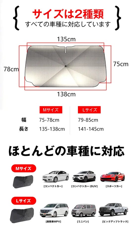 - サイズは2種類、どの車種にも対応します。折り畳み傘の様にコンパクトに収納でき、持ち運びも便利☆