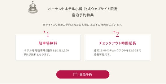 オーセントホテル小樽公式HPからご予約いただきますと、駐車場無料、チェックアウト時間延長の特典がございます。是非ご利用くださいませ。