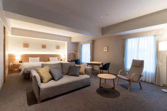 北海道産家具を設えたやわらかく落ち着いた雰囲気の室内。 水回りの設備もゆとりある造りとなっており、ごゆっくりお寛ぎいただける広々とした空間でございます。サロンクラス専用の【SALON CLASS LOUNGE】では、ホテルメイドの焼き菓子やフルーツの産地として有名な余市産のフルーツジュース、小樽地ビールや北海道生ワイン、おつまみ等をご用意しております。心休まる時間をお過ごしください。