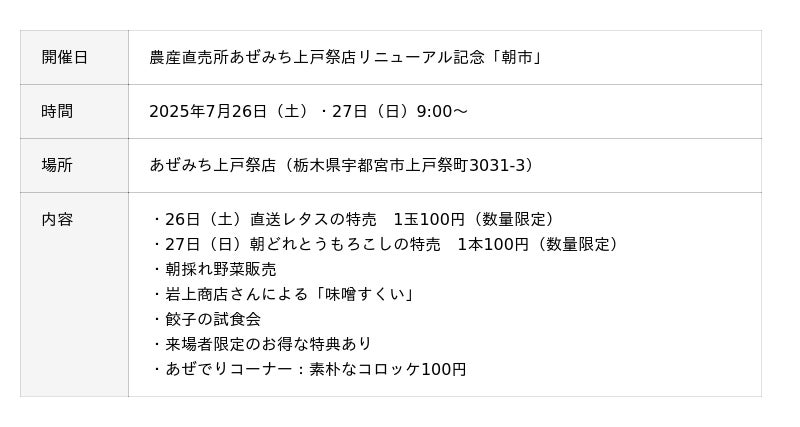 これに合わせて、7月26日(土)・27日(日)にはリニューアル記念イベント「朝市」を開催。朝採れ野菜や地元の名産品など、多くの商品を揃え、地域の皆さまをお迎えします。