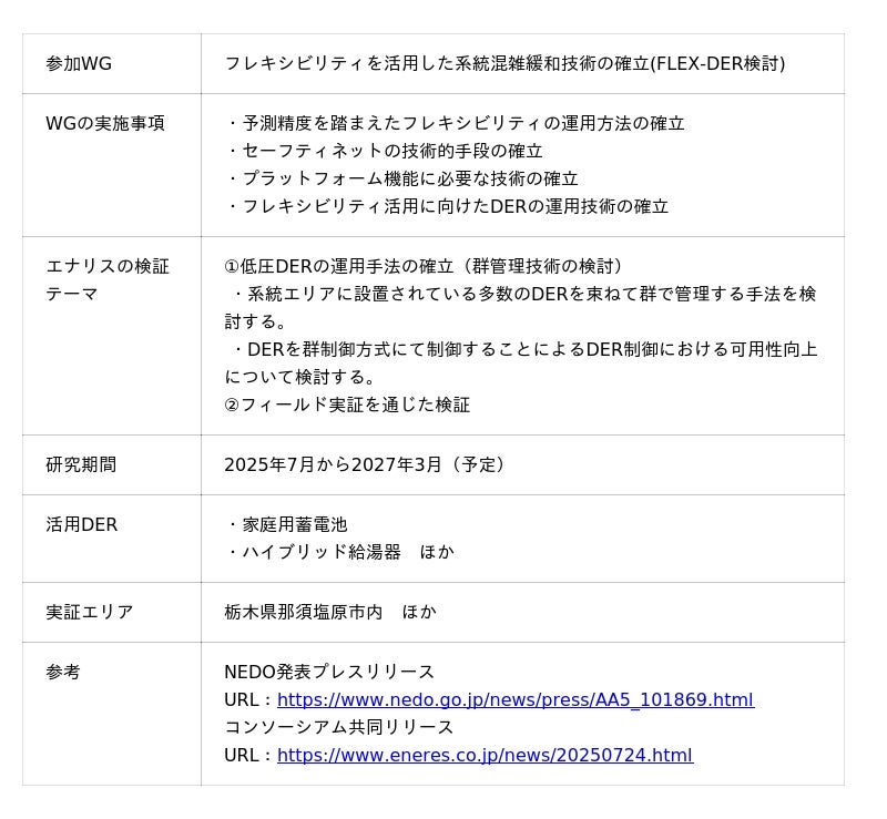 株式会社エナリス(本社:東京都千代田区、代表取締役社長:都築実宏、以下、エナリス)は、東京電力パワーグリッド株式会社(以下、東電PG)をはじめとする10者と共同で、国立研究開発法人新エネルギー・産業技術総合開発機構(以下、NEDO)が実施する「2025年度 電源の統合コスト低減に向けた電力システムの柔軟性確保・最適化のための技術開発事業(日本版コネクト&マネージ2.0)/研究開発項目1 DER等を活用したフレキシビリティ技術開発(以下、本事業)」の公募に応募し、採択されました。事業期間は2025年7月から2027年3月までを予定しています。