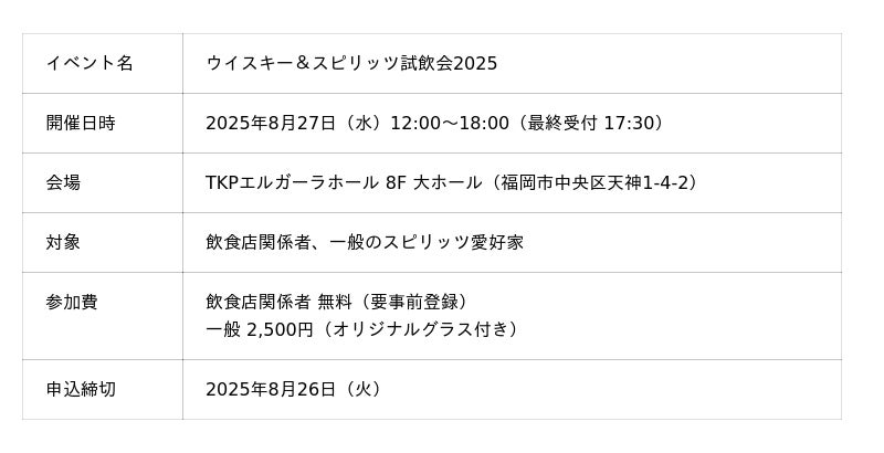 ウイスキー、ジン、ラム、テキーラ、ブランデー…。世界中の蒸留酒約300ブランドが一堂に集まる九州最大級の試飲イベント「ウイスキー&スピリッツ試飲会2025」が、2025年8月27日(水)、福岡・天神にて開催されます。主催はALLIQ(株式会社オーリック)。全国でも数少ない業界特化型の試飲会でありながら、一般参加も可能な“味覚の祭典”として、注目を集めています。