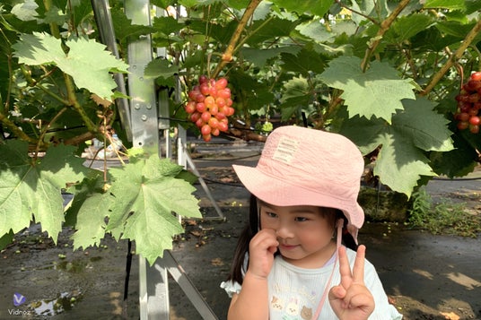 また、次回のイベントには家族連れでの参加も大歓迎です。組立式果樹棚の前でピースをしている4歳くらいの女の子のように、家族のみんなで楽しい時間を過ごして頂けます。この果樹棚は、ぶどうの房が地面から1メートル程度の高さに位置するため、小さなお子様でも簡単にぶどうを収穫することができます。