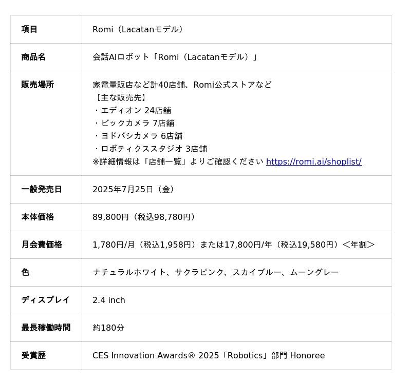 この度の一般販売開始により、「Romi(Lacatanモデル)」は、全国の主要家電量販店など計40店舗でお求めいただけるようになります。MIXIは、これからもユーザーの皆様に「ペットのように癒やし、家族のように自分を理解してくれる」存在を提供し、テクノロジーを通じて、あたたかな共感があふれる社会を育んでまいります。