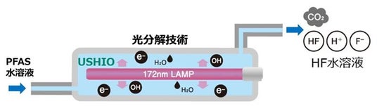 ウシオの光分解技術は、触媒、添加物を用いることなく、水溶液中のPFASに対して、直接、光を照射して分解する国内初の新技術です。波長172nmのエキシマランプとOHラジカル、水和電子の反応を組み合わせることで、常温・常圧でppmレベルの高濃度PFASを短時間で99%以上分解が可能であり、フッ酸やCO2まで無機化することができます。