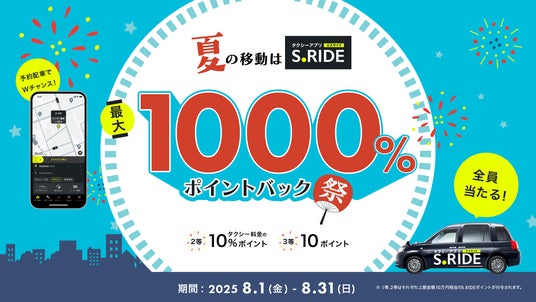 タクシー配車アプリ「S.RIDE(エスライド)」を提供する S.RIDE 株式会社(本社:東京都港区、代表取締役社長:橋本洋平)は、2025年8月1日(金)~8月31日(日)の期間限定で、「夏の移動はS.RIDE!最大1000%ポイントバック祭」を実施します。本キャンペーンでは、S.RIDEアプリで配車したすべてのお客様を対象に、ハズレなしの抽選でS.RIDEポイントをプレゼントします。1等に当選すると、乗車料金の1000%分(※)がポイントで還元されます。