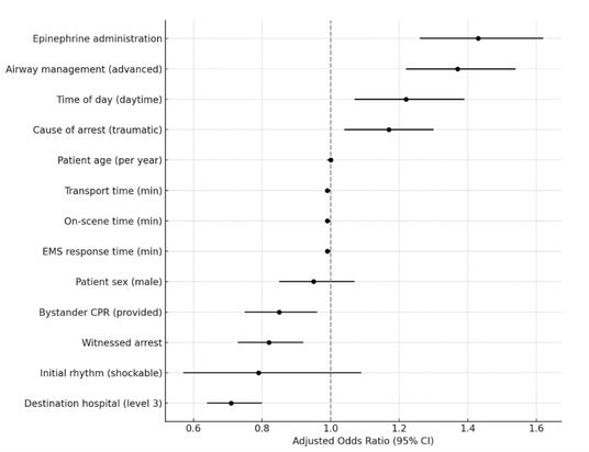 ・統計モデルにより、目撃された心停止や市民による心肺蘇生、救命救急センター等への搬送は、生存率の向上に有意に関連していました。