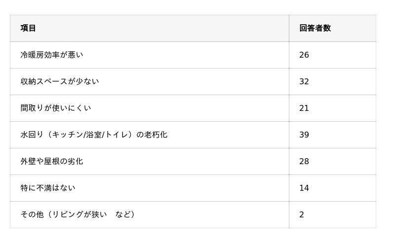 ・自宅で不満に思っているという方が最も多いのは、「水回りの老朽化」で、次いで「収納スペースが少ない」。