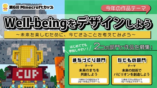 Minecraftカップは、高校生以下の子どもたちを対象に指定のテーマに沿って「教育版マインクラフト」で作られた作品を国内外から募集し、内容を競い合う大会です。 今大会では「17のSDGs目標が達成された後の未来」を描く人材を育てることを目的に「Well-being をデザインしよう」が大きなテーマです。テーマを踏まえ、2つの部門で作品を募集します。