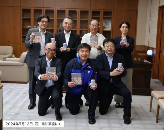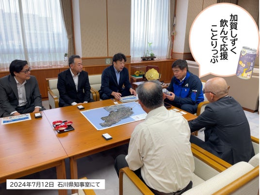 多くの方にご協力をいただきながら、完成した「J-CRAFT TRIP 加賀しずくサワー」。北陸など一部エリアでの先行発売に先立ち、7月12日に石川県庁を訪問し、馳知事に完成した商品の紹介を行いました。知事からは、好評と共に「生産者の励みにもなる嬉しい取り組み」とのご感想と合わせて「加賀しずく 飲んで応援 ことりっぷ」と本商品にちなんだ一句を詠んでいただきました。