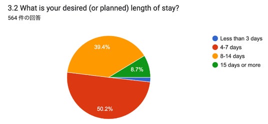 大多数の回答者(89.6%)が1週間から2週間の滞在を希望または計画していることがわかります。約半数が4-7日間の比較的短期の滞在を選んでいる一方で、39.4%がより長めの8-14日間の滞在を望んでいます。15日以上の長期滞在を希望する人は少数(8.7%)で、3日未満の極短期滞在はごくわずか(1.7%)となっています。