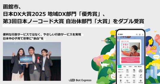 株式会社Bot Express(本社:東京都港区、代表取締役:中嶋 一樹、以下 Bot Express)は、スマホ市役所導入自治体である函館市が、2025年7月16日・17日に開催された、日本DX大賞2025において「地域DX部門・優秀賞」を、同日開催の第3回日本ノーコード大賞において「自治体部門・大賞」を受賞したことをお知らせいたします。