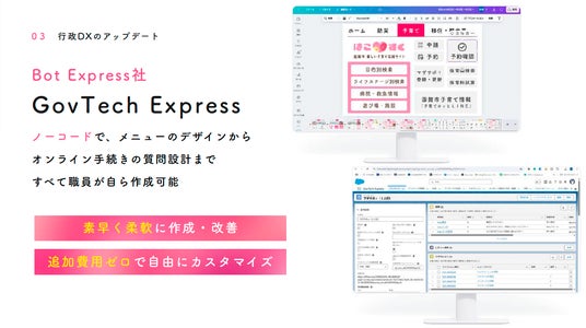 本取組はBot Expressが開発提供する官公庁専用対話型アプリケーション「GovTech Express」を活用し構築されており、全国330以上の導入自治体は子育て支援のテンプレートとして、追加費用なく利用可能です。