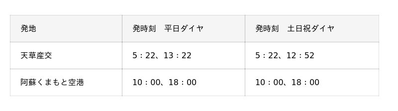 【停留所】天草産交、本渡バスセンター、前島、二号橋、さんぱーる、三角産交、宇城市不知火支所前、阿蘇くまもと空港(5番のりば)