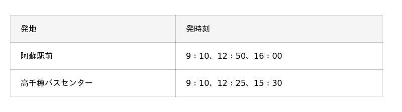 【停留所】阿蘇駅前、カドリードミニオン前、乙姫ペンション村入口、火の山温泉どんどこ湯、西栃木、白川水源入口、高森湧水トンネル公園入口、高森駅交流施設、高千穂バスセンター