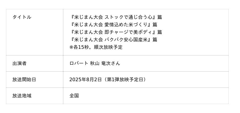 アイリスオーヤマ株式会社(本社:宮城県仙台市、代表取締役社長:大山 晃弘)は、お笑いトリオ ロバートの秋山 竜次さんを起用したパックごはん「低温製法米のおいしいごはん(R)」の新TVCM『米じまん大会』シリーズの放映を、2025年8月2日より全国で順次開始します。