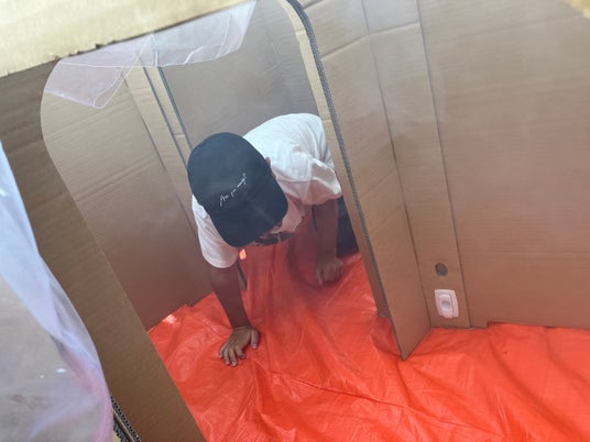 スモーキー迷路前が見えなくなるくらいの煙(水蒸気)の中、できるだけ煙を吸わないように避難完了を目指す、火事を想定した迷路です。
