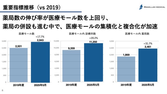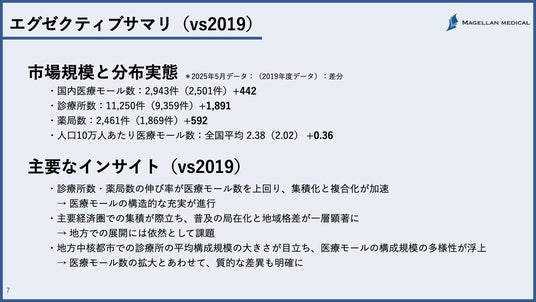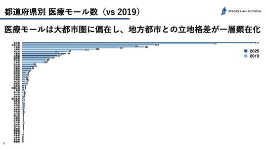 本レポートは、マゼランメディカルが所有するデータベースに基づいて、全国の医療モール数や診療所数・薬局数・立地分布・診療科目構成などを集計し、2019年度から2025年5月までの変化を都道府県別に比較分析したものです。