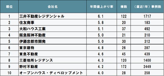 5位の伊藤忠都市開発は、住まいづくりの指針に「創造」と「信頼」を掲げ、伊藤忠グループとしての強みを生かした物件供給で都市部へのマンション供給割合が高く、値上がり率5位となりました。