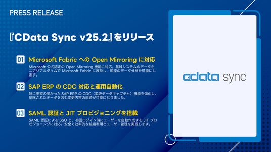 2025年8月1日、リアルタイムデータ連携コネクタを提供するCData Software Japan 合同会社(本社:アメリカノースカロライナ州、日本オフィス:宮城県仙台市、代表社員 職務執行者:疋田 圭介、以下CData)は、400種類以上のSaaS・DB データをノーコードでETL / ELT可能な『CData Sync』の新バージョン、V25.2をリリースしました。本バージョンでは、Microsoft 社の統合データプラットフォーム「Microsoft Fabric / OneLake」へのニアリアルタイムなデータ連携を実現する「Open Mirroring」にMicrosoft 公式認定パートナーとして対応。加えて、CDC(変更データキャプチャ)のデータソースとして新しくSAP ERP のサポートを追加、また大規模な組織利用を促進するSAML 認証によるシングルサインオン(SSO)およびJIT(Just-In-Time)プロビジョニング機能も搭載しました。