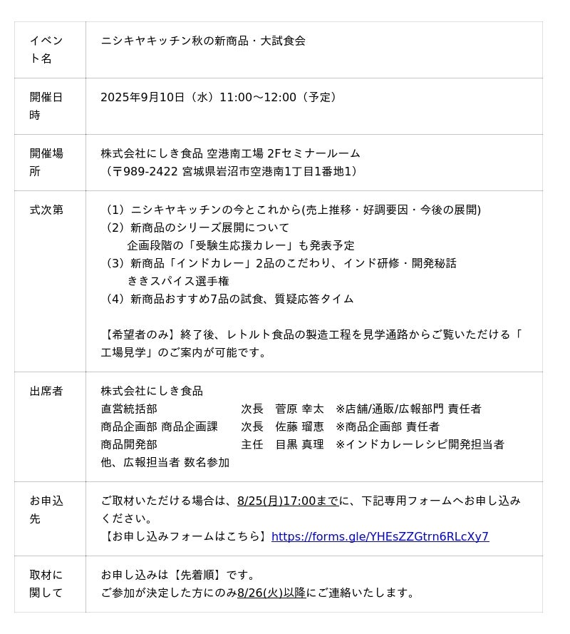 「世界の料理を『カンタン』に。」をコンセプトに掲げ、レトルトカレーを中心に販売するレトルト食品専門店NISHIKIYA KITCHEN(ニシキヤキッチン)(株式会社にしき食品 本社:宮城県岩沼市、代表取締役社長:菊池洋一)は、2025年9月10日(水)に「秋の新商品・大試食会」を開催します。ニシキヤキッチンがメディア関係者向けで、新商品発売前に大々的な試食会を開催するのは今回が初めてです。新商品を試食いただきながら、ここでしか聞けない開発の裏話や、企画段階の「受験生応援カレー」についても発表します。報道陣の皆さまにおかれましては、お忙しい時節柄ではございますが、万障お繰り合わせの上ご取材賜りますようお願い申し上げます。