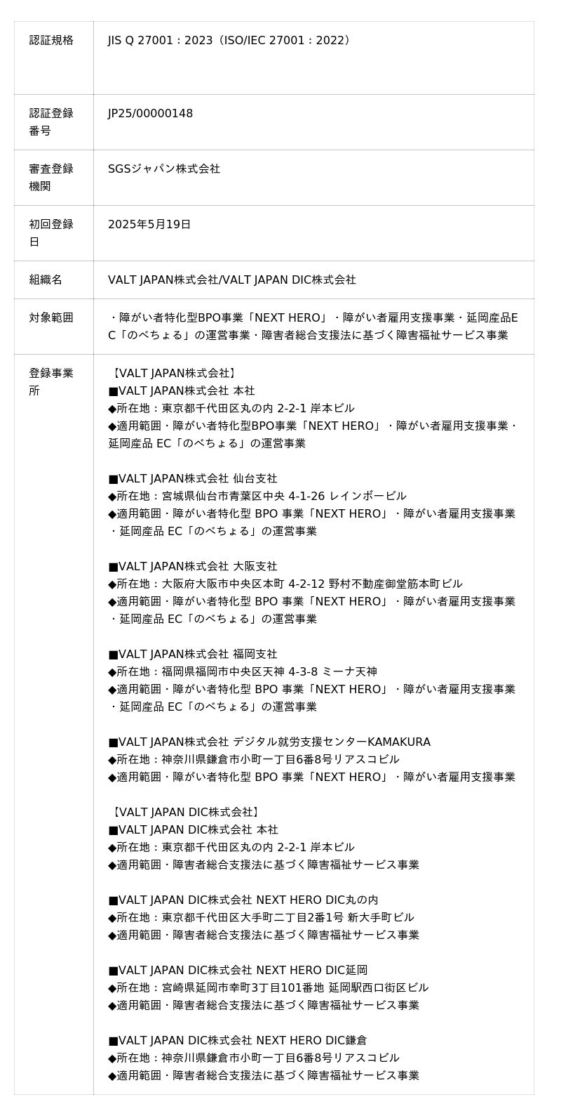 VALT JAPAN株式会社およびVALT JAPAN DIC株式会社(本社:東京都千代田区、代表取締役 CEO:小野貴也。以下「当グループ」)は、2025年5月19日付で情報セキュリティマネジメントシステム(ISMS)の国際規格「ISO/IEC 27001:2022」および、その国内規格「JIS Q 27001:2023」の認証を取得いたしました。