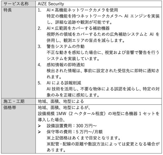 実証実験においては、画像認識プラットフォーム・AIZE(アイズ)をはじめとしてAIの社会実装に多くの実績を有する当社が、ジャパンインベストメントアドバイザーが管理する太陽光発電所において、AI監視カメラを活用したソリューションを試行してまいりました。その結果、一定の成果が見込めるものと判断し、今般サービス提供の開始を決断いたしました。サービス提供の開始にあたり、本契約を締結し、当社は主に技術開発、工事の進捗管理及び契約管理を担い、ジャパンインベストメントアドバイザーは主にマーケティング及び営業活動を担ってまいります。