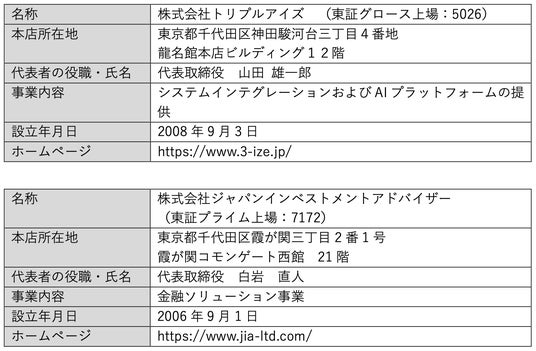 2024年7月31日、株式会社トリプルアイズ(本社:東京都千代田区、代表取締役:山田 雄一郎、東京証券取引所グロース市場《証券コード:5026》、以下トリプルアイズ)は、株式会社ジャパンインベストメントアドバイザー(本社:東京都千代田区、代表取締役:白岩 直人氏、東京証券取引所プライム市場《証券コード:7172》、以下ジャパンインベストメントアドバイザー)との間で、太陽光発電所の銅線盗難防止ソリューションを共同で事業展開することを目的とした、業務提携契約(以下、「本契約」)を締結いたしましたので、下記のとおりお知らせいたします。