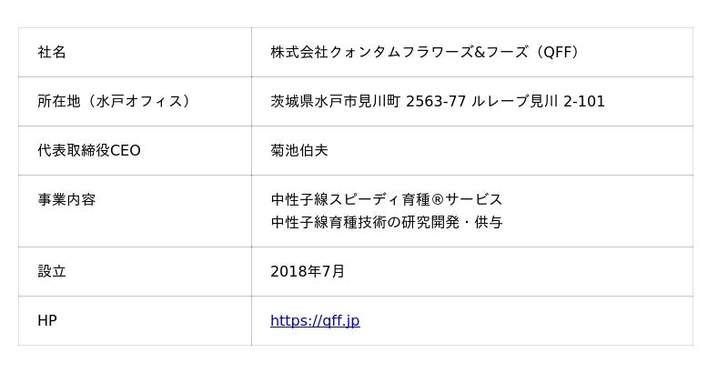 量子バイオテクノロジーを活用した超高速品種改良サービス「中性子線スピーディ育種(R)」を提供する 株式会社クォンタムフラワーズ&フーズ(本社:東京都中央区日本橋人形町 3丁目7番14号、代表取締役CEO:菊池 伯夫、以下「QFF」)は、2025年9月2日(火)大阪・梅田サウスホールで開催される「MUFG Startup Summit 2025 in OSAKA(MSS大阪)」にブース出展いたします。耐暑性・高栄養・高機能作物や、食品・発酵微生物など、中性子線スピーディ育種(R)による開発事例をご紹介し、商談や共同研究のご相談の機会を創出いたします。