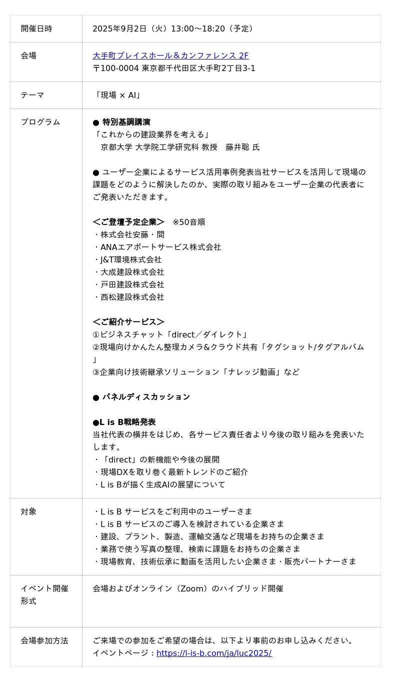 株式会社L is B(エルイズビー 本社:東京都千代田区、代表取締役社長CEO:横井 太輔、以下「L is B」)は、L is Bのサービス事例発表会となるユーザーカンファレンス「L is B User Conference2025」(以下「LUC」)を2025年9月2日(火)に開催します。併せて、会場参加申し込みの受付も開始しました。