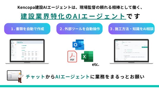 株式会社KENCOPAは、建設業に特化した生成AI「Kencopa建設AIエージェント」を開発しています。本サービスは現場単位で散在する情報を集約し、AIが業務支援を行います。担当者はチャットで指示を送るだけで、外部ツールを自動操作して書類を即時に作成可能。さらに未経験の施工方法や専門知識についてもAIに相談でき、迅速で確実な意思決定をサポートします (一部開発中機能を含む)